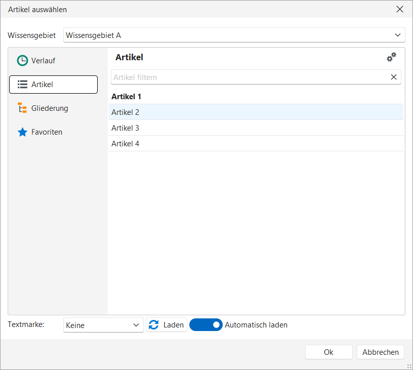 lexiCan öffnet daraufhin ein Dialogfenster. Wählen Sie den Artikel, der Ziel des Links sein soll, z.B.