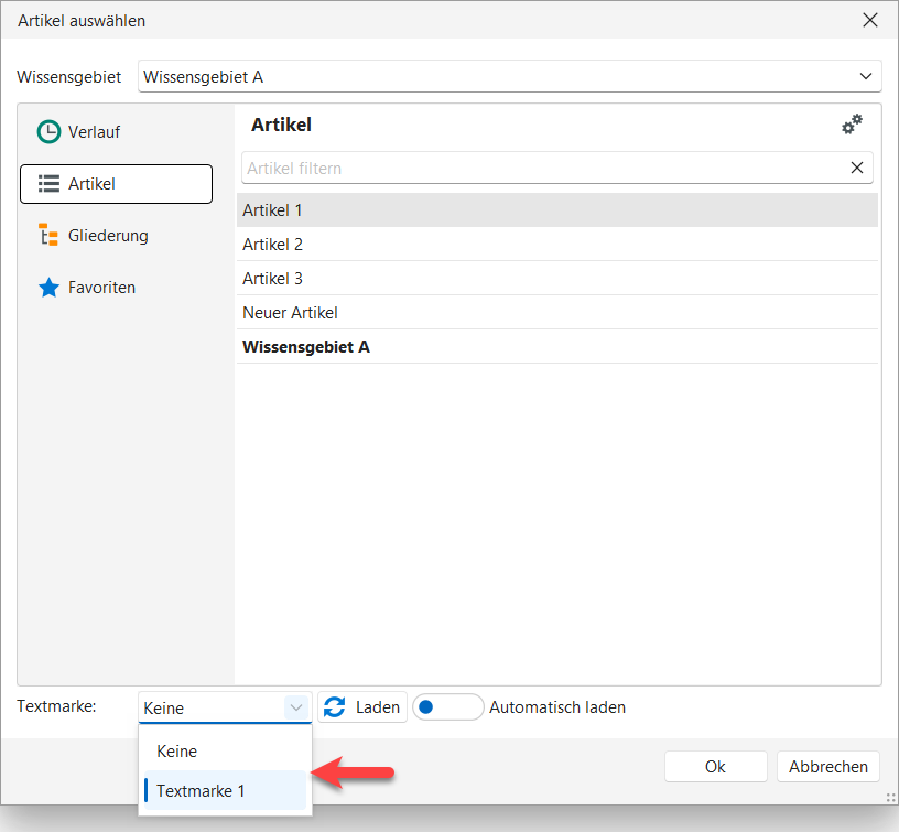 lexiCan lädt daraufhin die Textmarken des Artikels und stellt sie in einem Pull-down Menü zur Auswahl.